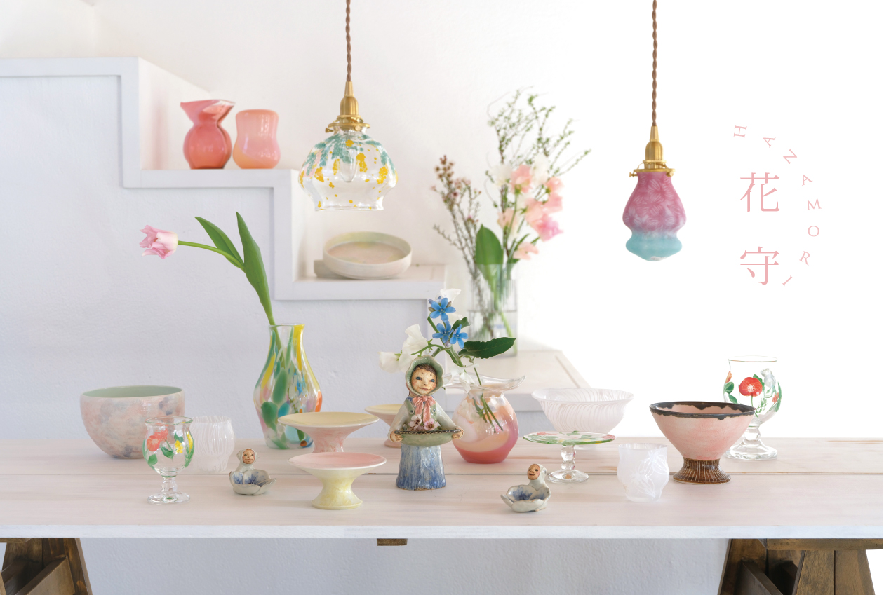 陶磁器・ガラス 毎年恒例の春の3人展 テーマは「花守」 花の番人「花守はなもり」 美しくかわいらしい花々のような作品をたっぷりご用意して会場にてお待ちいたしております。