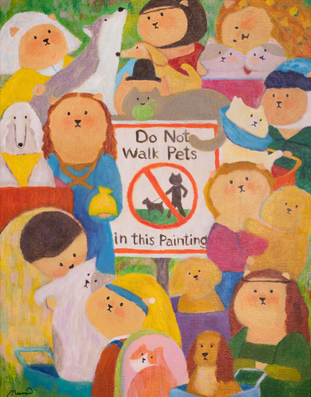 美術館で中世やルネサンス、印象派など肖像画を眺めるのが大好きです。描かれているのが貴族であれ庶民であれ、彼らもかつては生身の人間だったのだと思うと、服装やポーズ、そして顔つきから、その人の暮らしの細部をつい想像してしまいます。「飼い主はペットに似る」という言葉がありますが、もしこの画中の人々がペットを飼っていたら、一体どんな動物を選んだのでしょうか。そんな想像から、主人(画中の美人)のイメージに合わせて、彼女たちにぴったりなペット(野獣)を「無中生有(むちゅうしょうゆう)」のごとく生み出してみました。「ミーモ(Meemaw)」は、これといった特徴のない猫です。誰かの真似をすることで、自分の存在意義を探しています。彼は喜びも悲しみも表に出しません。ただ、「いつ、どこで、どんな役を演じれば、自分が心地よく存在できるのか」。その瞬間を静かに探し求めているのです。
